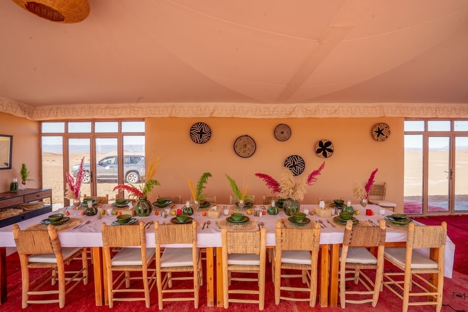 amenities - This campground offers designated smoking areas. dining - At Erg Chegaga Desert Luxury Camp, enjoy a satisfying meal at the restaurant. Wrap up your day with a drink at the bar/lounge. A complimentary continental breakfast is served daily from 7 AM to 10 AM. business_amenities - Featured amenities include a 24-hour front desk and multilingual staff. rooms - Make yourself at home in one of the 8 guestrooms. Bathrooms with showers are provided. Conveniences include separate sitting areas and blackout drapes/curtains, and housekeeping is provided daily. attractions - Distances are displayed to the nearest 0.1 mile and kilometer. Mhamid Main Square - 0.9 km / 0.5 mi Mosque Mhamid - 0.9 km / 0.6 mi Oulad Driss Kasbah - 6.2 km / 3.9 mi location - With a stay at Erg Chegaga Desert Luxury Camp in M'Hamid El Ghizlane, you'll be within a 15-minute walk of Mhamid Main Square and Mosque Mhamid. This campground is 3.9 mi (6.2 km) from Oulad Driss Kasbah. headline - Near Mhamid Main Square