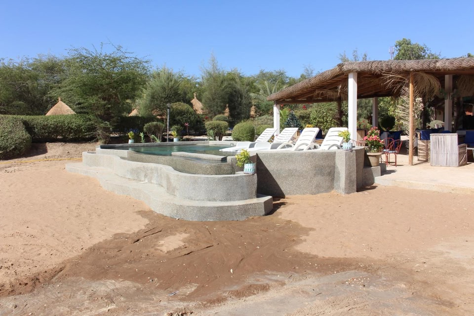 Hôtel Les Cordons Bleus sits between the Gambia and the Saloum delta in Ndangane in southern Senegal. The outdoor swimming pool is surrounded by a furnished sun deck, which overlooks the delta.